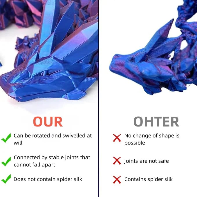 Our this 3D printed dragon is made of safe and environmentally friendly PLA, which is a food-grade, all-natural, non-hazardous, and fully biodegradable material that is great for children and home environments.🐉