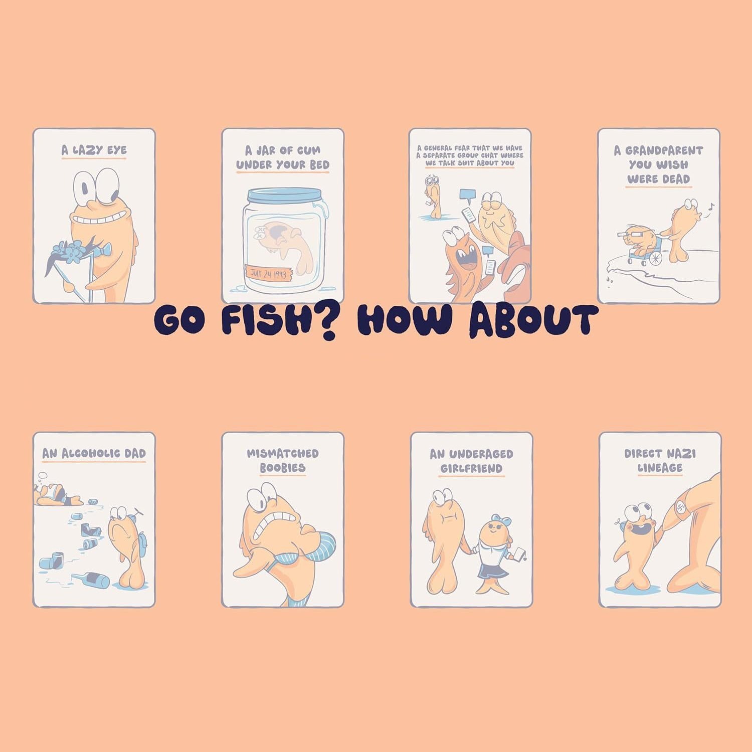Go Fish? How about ! A hilarious adult spin on a classic card game. Go fishing for the embarrassing cards your friends hold in their hand and if you guess wrong!![]()