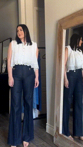 Our best-selling denim trousers, are refreshed with nautical details! This pair comes with a high rise and a full-length leg, plus patch pockets and our signature gold crest button details for added drama.