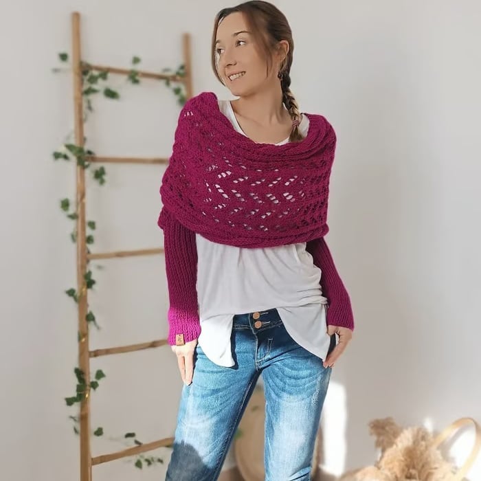 The sweater scarf with sleeves is knitted with two needles in an openwork pattern that simulates stitches and cables on the top and bottom, made of soft, durable and high-quality viscose knit.